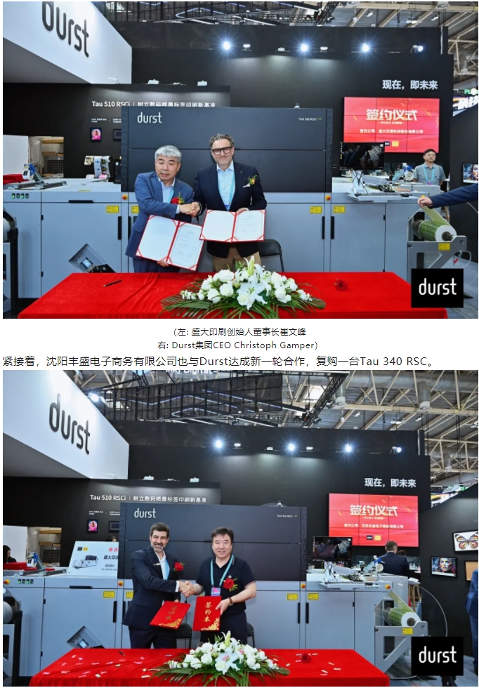 時(shí)至中午,Durst展位便迎來了簽約高潮。盛大印刷繼去年德魯巴一舉投資5臺Tau 510 RSCi之后,又再次復(fù)購三臺Tau 340 RSCi數(shù)碼標(biāo)簽印刷機(jī)。