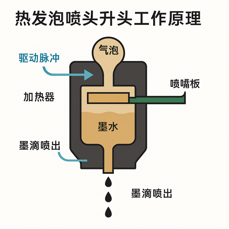 熱發(fā)泡噴頭依靠微型電阻將墨水局部瞬間加熱(溫度可達(dá)300℃以上),產(chǎn)生氣泡膨脹,將墨滴推出噴嘴。該技術(shù)起源于消費(fèi)級打印機(jī)領(lǐng)域,具有制造工藝成熟、打印分辨率高、結(jié)構(gòu)簡單等優(yōu)點(diǎn)。