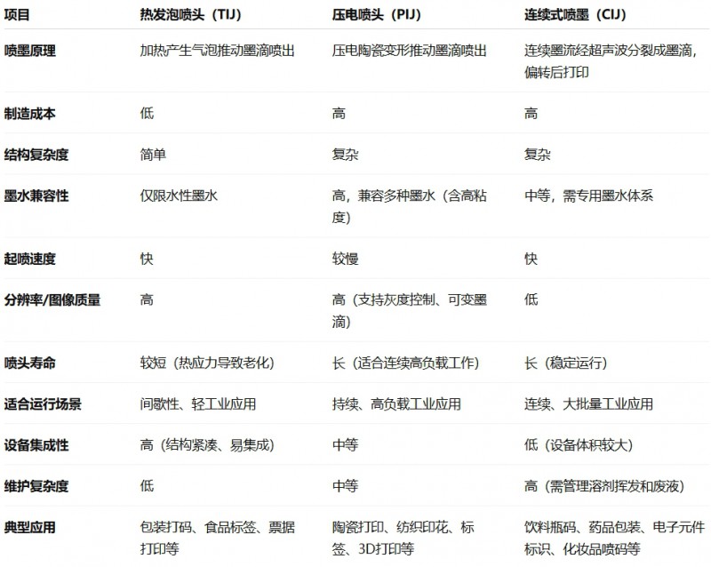 熱發(fā)泡噴墨(TIJ):適合對圖像質(zhì)量要求高、結(jié)構(gòu)緊湊、成本敏感的場景,如標(biāo)簽打碼、輕工業(yè)應(yīng)用。