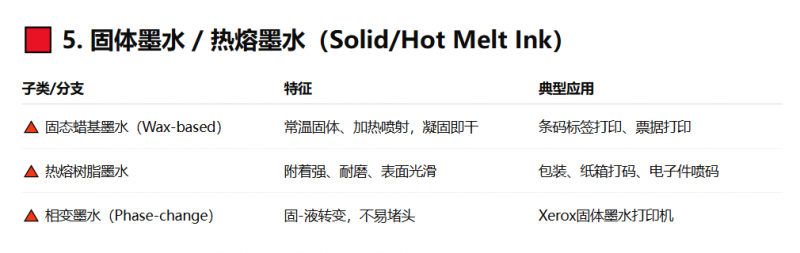 定義:常溫為固態(tài),打印時需加熱成液態(tài)再噴射,冷卻后快速固化。清潔環(huán)保,如Xerox固體墨水。