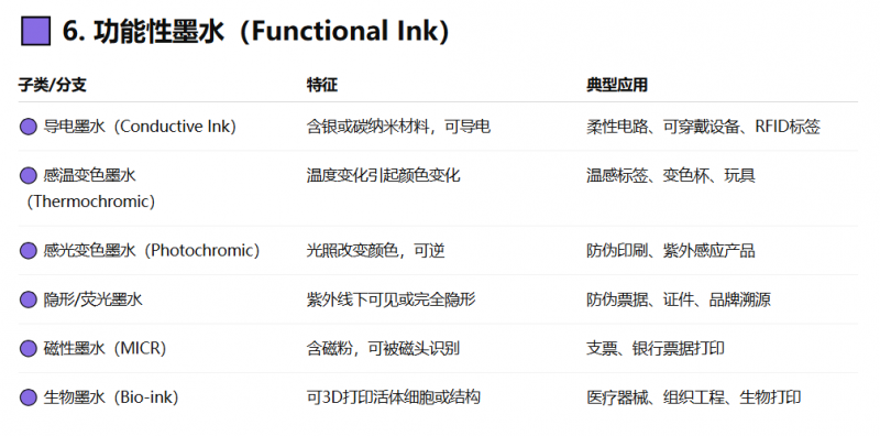 定義:功能性墨水是一類具備特殊物理、化學或生物特性的印刷材料,通過納米技術(shù)、高分子合成等科技手段賦予其導電、溫敏、光變、抗菌等超越傳統(tǒng)墨水的新功能。