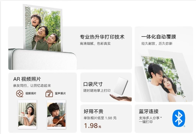 更值得一提的是,該打印機(jī)支持 AR 視頻照片功能。用戶可在米家 App 內(nèi)為照片選擇關(guān)聯(lián)一段最長 15 秒的短視頻或 60 秒的音頻,打印出來的靜態(tài)照片通過米家 App “掃一掃” 即可播放關(guān)聯(lián)的動態(tài)記憶,讓照片 “動” 起來,為回憶增添了更多生動的元素。另外,“留聲照片” 功能允許用戶在打印時錄制或上傳語音,接收者掃描照片即可聽到聲音,讓情感傳遞更加立體。