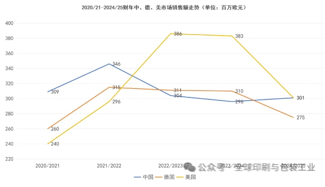 在過去五年中,海德堡在中國和美國的銷售表現(xiàn)呈現(xiàn)出動(dòng)態(tài)變化的趨勢(shì)。中國市場在初期曾占據(jù)優(yōu)勢(shì),隨后美國市場在中間兩年實(shí)現(xiàn)反超,而到了最新的2024/25財(cái)年,兩國市場則達(dá)到了驚人的平衡狀態(tài)。這種銷售額的此消彼長以及最終的持平,反映了海德堡在全球兩大關(guān)鍵市場所面臨的不同機(jī)遇和挑戰(zhàn),以及其可能采取的區(qū)域性策略調(diào)整。