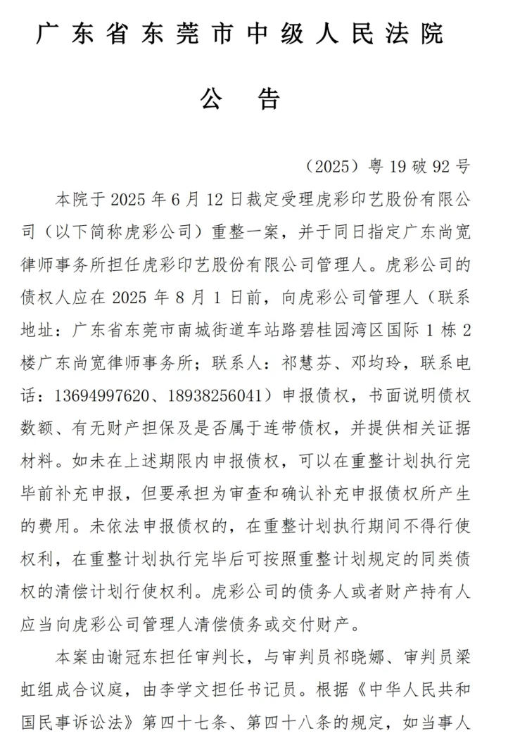 根據(jù)東莞市中級(jí)人民法院的公告,虎彩公司的債權(quán)人應(yīng)在8月1日前,向廣東尚寬律師事務(wù)所申報(bào)債權(quán)。