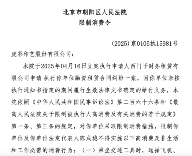 天眼查信息顯示,因在一起合同糾紛中,未按指定期間履行生效法律文書(shū)確定的給付義務(wù),今年5月,北京市朝陽(yáng)區(qū)人民法院對(duì)虎彩公司以及公司法定代表人陳成穩(wěn)發(fā)出限制消費(fèi)令。