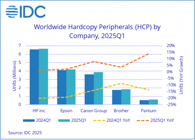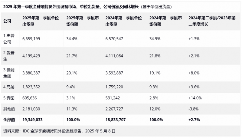 2025年第一季度,全球HCP市場連續(xù)第三個(gè)季度同比增長,出貨量達(dá)約1940萬臺(tái),增幅達(dá)2.7%。另一方面,根據(jù)IDC全球季度打印輸出設(shè)備追蹤報(bào)告,出貨量總額同比下降3.2%,至約90億美元。