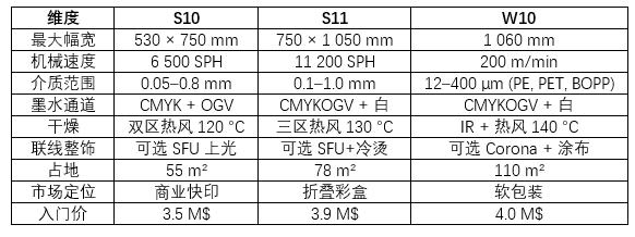 W10 為卷筒紙印刷機,最大幅寬可達 1.06m,主要面向軟包裝印刷市場。卷筒紙印刷的特點決定了其在連續(xù)印刷方面的優(yōu)勢,能夠滿足軟包裝印刷對高效、連續(xù)生產(chǎn)的需求。在速度方面,W10 雖然沒有像 S11 那樣極高的單張紙印刷速度,但在卷筒紙連續(xù)印刷的場景下,其生產(chǎn)效率也十分可觀。在介質(zhì)上,W10 專注于軟包裝常用的塑料薄膜等材料的印刷。在坐標圖中,W10 處于幅面較寬、適合卷筒紙連續(xù)印刷且針對特定軟包裝介質(zhì)的區(qū)域,精準服務于軟包裝印刷領域。