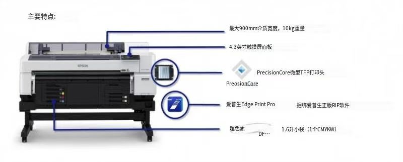 SureColour G6000 采用節(jié)省空間的前端進紙設(shè)計,在不犧牲功能前提下實現(xiàn)高性能打印。設(shè)備支持寬達 90 厘米(35.4 英寸)的介質(zhì),配備自動維護系統(tǒng)、織物打印頭擦拭清潔系統(tǒng)等先進功能。其搭載愛普生獨家 PrecisionCore Micro TFP 打印頭技術(shù),結(jié)合噴嘴驗證功能,可大幅減少生產(chǎn)停機時間,顯著提升可靠性。