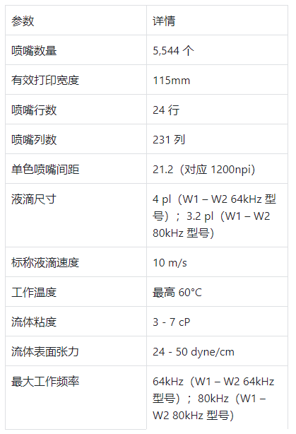 施樂 ® W 系列打印頭在設(shè)計(jì)上獨(dú)具匠心,以滿足工業(yè)生產(chǎn)的嚴(yán)苛需求。在 4.5 英寸(約 115mm)的打印陣列中,分布著多達(dá) 5,544 個(gè)活動(dòng)噴嘴 ,這些噴嘴排列為 24 行,231 列 ,構(gòu)成了精密的噴射系統(tǒng)。以下是其詳細(xì)參數(shù)表格: