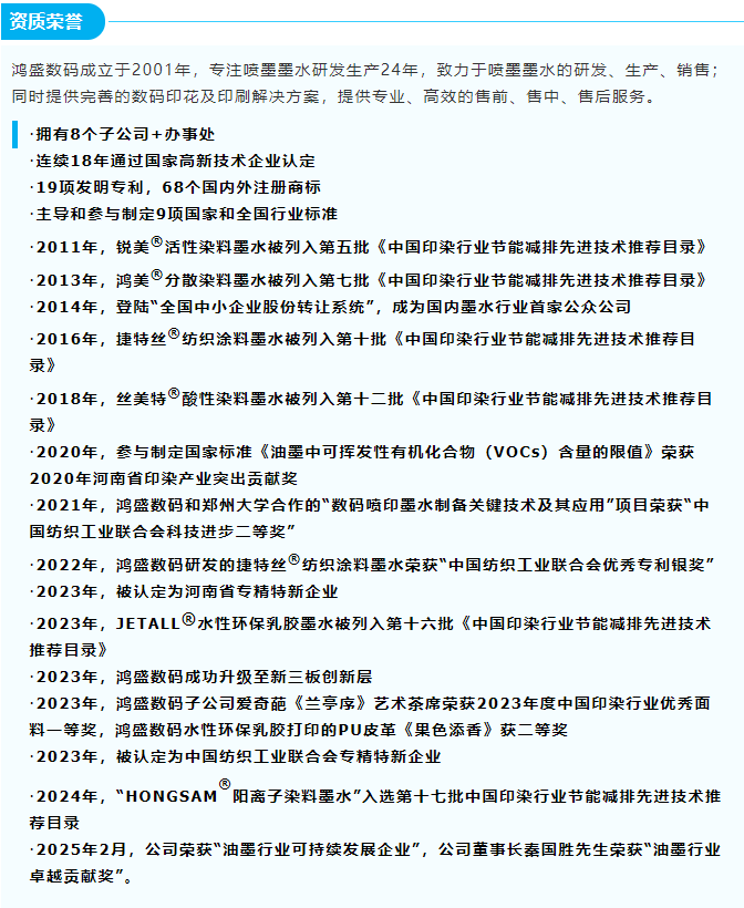 當(dāng)然,水性環(huán)保、綠色安全是我們優(yōu)勢(shì)的基石。乳膠油墨采用純水基配方、不含有機(jī)溶劑,鴻盛數(shù)碼作為《油墨中可揮發(fā)有機(jī)化合物VOCs含量的限值》國(guó)家標(biāo)準(zhǔn)的定制單位,從墨水源頭保證企業(yè)綠色環(huán)保生產(chǎn);水性環(huán)保墨水并且獲得OEKO-TEX® ECO PASSPORT認(rèn)證,歐盟訂單直通。