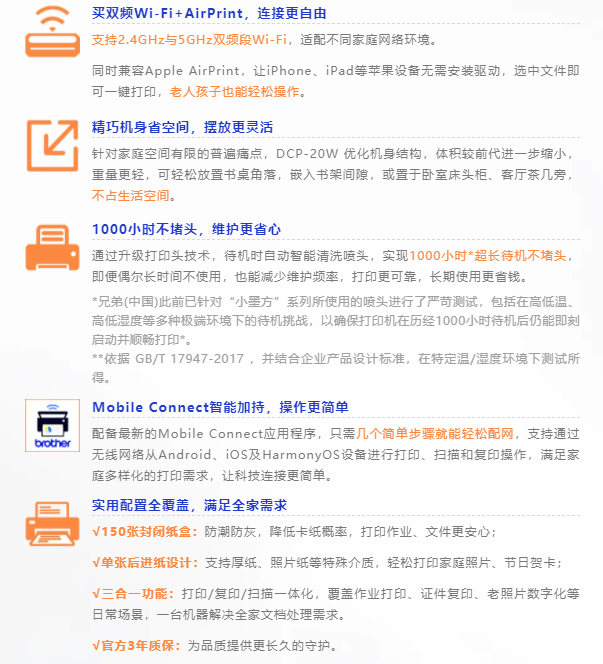 如果說云充模式是Brother DCP-20W噴墨多功能一體機的核心底氣,那么硬件與功能的全面優(yōu)化,則讓這款新機更懂中國家庭的使用習(xí)慣。