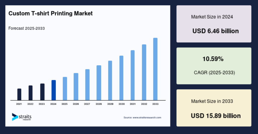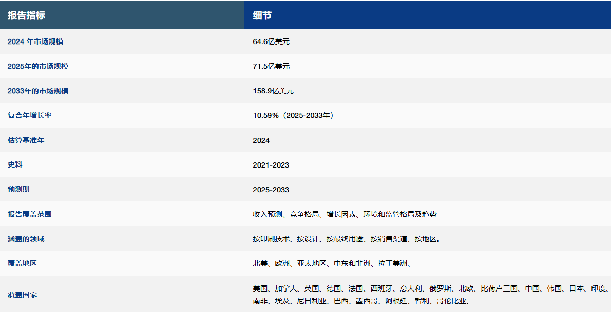 2024 年全球定制 T 恤印花市場(chǎng)規(guī)模為 64.6 億美元 ,預(yù)計(jì)將從 2025 年的 71.5 億美元增長(zhǎng) 到 2033 年的 158.9 億美元, 預(yù)測(cè)期內(nèi) (2025-2033 年) 的復(fù)合 年增長(zhǎng)率 為 10.59% 。