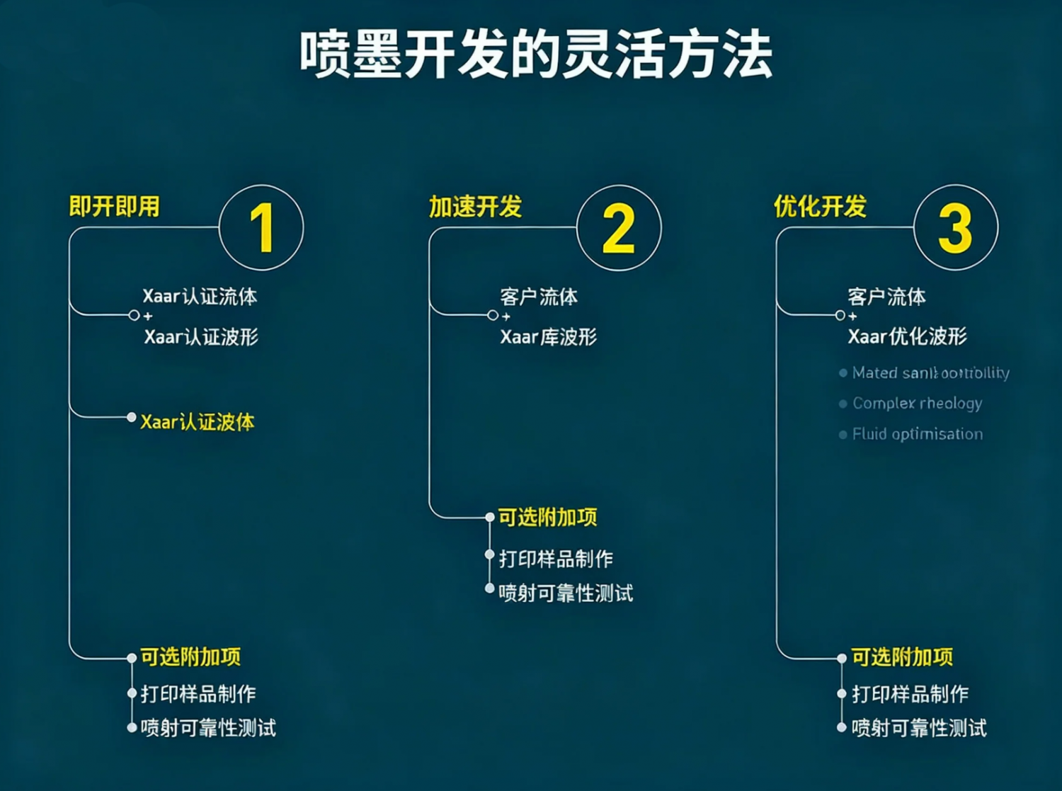 新工藝支持三種關(guān)鍵的開(kāi)發(fā)路徑。最快捷的途徑是從一系列預(yù)先批準(zhǔn)的流體中進(jìn)行選擇,每種流體都提供定制的波形,并已確認(rèn)與 Xaar 打印頭兼容。這些流體已針對(duì)多種應(yīng)用進(jìn)行了優(yōu)化,可實(shí)現(xiàn)快速的系統(tǒng)集成。