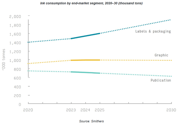 史密瑟斯發(fā)布的一份新的市場報告——《2030 年全球油墨市場展望》——指出,到 2025 年,用于商業(yè)圖形、出版、包裝和標簽印刷的油墨需求量將達到 330 萬噸,價值 358 億美元,到 2030 年將增至 402 億美元。