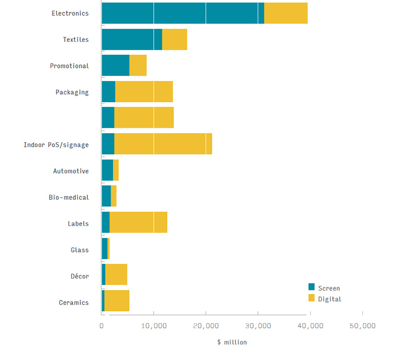 根據(jù)史密瑟斯公司最新研究,到 2025 年,絲網(wǎng)印刷和數(shù)碼印刷在工業(yè)印刷應(yīng)用領(lǐng)域的總價(jià)值將達(dá)到 817 億美元,占全球市場(chǎng)價(jià)值的 58.8% 和銷量的 75.1%。