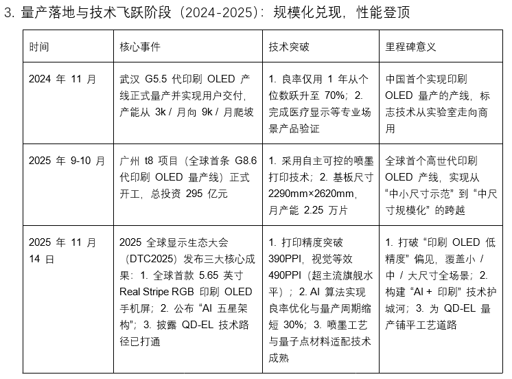 • 噴墨打印技術(shù)打破了蒸鍍工藝的專利壟斷,中國(guó)企業(yè)通過(guò)自主研發(fā),在打印頭適配、墨水配方、AI 校正算法等核心環(huán)節(jié)積累了超過(guò) 3000 項(xiàng)專利,構(gòu)建了自主可控的技術(shù)體系;