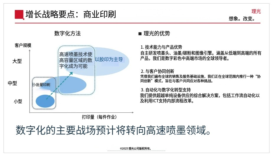 圖示展示了商業(yè)印刷數(shù)字化發(fā)展的方向。矩陣圖以印刷量為橫坐標,以客戶規(guī)模為縱坐標,展示了高速噴墨技術驅動的數(shù)字化如何從小批量印刷擴展到中批量和大批量印刷。右側重點突出了理光的核心優(yōu)勢——“技術和產(chǎn)品能力”、“與客戶共同創(chuàng)造價值(協(xié)同創(chuàng)新)”以及“自動化和數(shù)字化轉型支持”。下方的圖注寫道:“數(shù)字化的主要戰(zhàn)場預計將轉向高速噴墨領域。”