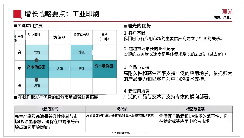 該圖表展示了理光工業(yè)印刷業(yè)務關鍵應用領域的拓展??v軸代表生產(chǎn)效率,橫軸代表市場細分,包括標牌和圖形、紡織品、標簽和包裝以及其他領域(例如3D打?。?ldquo;高份額”和“重點”等標注表明了理光現(xiàn)有的優(yōu)勢和需要進一步提升的目標領域。圖表右側重點突出了理光的優(yōu)勢——“客戶基礎”、“增長速度超過市場平均水平”、“產(chǎn)品和支持”以及“不斷拓展的新應用”。
