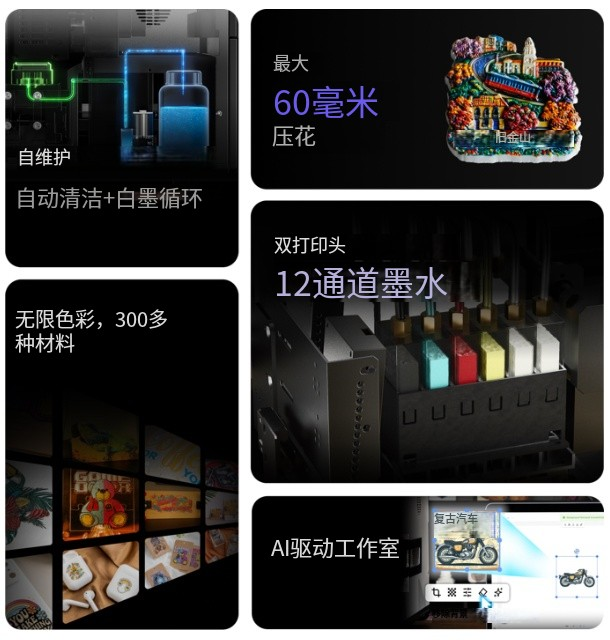 1440 DPI的高分辨率成像引擎,能在木材、金屬、玻璃、陶瓷、紡織品等300多種材料上精準(zhǔn)還原精細(xì)細(xì)節(jié)與真實(shí)色彩。更搭載AI輔助工作流程,支持圖像生成、背景去除、文本轉(zhuǎn)徽標(biāo)、草圖增強(qiáng)、雙激光定位等自動(dòng)化功能,大幅簡(jiǎn)化從設(shè)計(jì)到打印的全流程。無(wú)論是新手創(chuàng)作者的快速出圖,還是專業(yè)工作室的批量生產(chǎn),都能實(shí)現(xiàn)效率與創(chuàng)意的雙重提升。