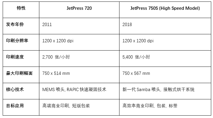 Table 1: JetPress 720與750S關(guān)鍵技術(shù)參數(shù)對(duì)比
