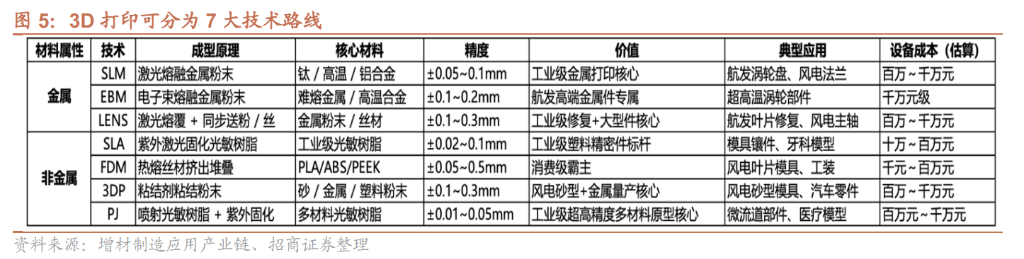 目前技術(shù)路線主要分為金屬與非金屬兩大陣營(yíng)。非金屬領(lǐng)域,F(xiàn)DM(熔融沉積)是消費(fèi)級(jí)的主流,占據(jù)全球61.6%的份額;而金屬領(lǐng)域,SLM(選擇性激光熔融)則是工業(yè)級(jí)的絕對(duì)核心,占據(jù)89.4%的份額,也是當(dāng)前資本市場(chǎng)關(guān)注的焦點(diǎn)技術(shù)。