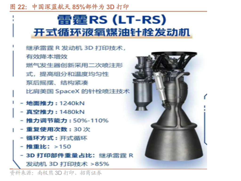 商業(yè)航天: 這是剛需中的剛需。SpaceX和國(guó)內(nèi)的深藍(lán)航天(85%部件3D打印)證明了該技術(shù)能將發(fā)動(dòng)機(jī)組件減少80%,制造周期縮短70%-80%。未來(lái)的主線是可重復(fù)使用火箭的高頻驗(yàn)證和衛(wèi)星的批量交付。