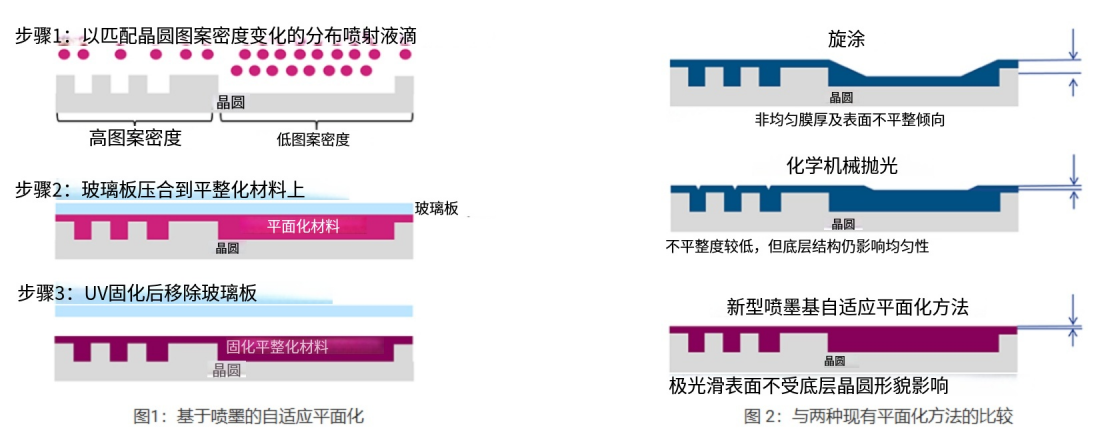 噴墨技術(shù)用于將光固化材料以精確控制的方式噴涂到晶圓的特定區(qū)域,以匹配表面形貌,包括電路圖案的分布。隨后,通過將一塊平坦的玻璃板壓在晶圓上,實現(xiàn)高精度平坦化。這使得在一次壓印工藝中即可精確地將直徑為 300 毫米的晶圓的整個表面整平,而無需考慮底層電路設(shè)計或形貌密度的變化。由此,形貌不規(guī)則性被降低到 5 納米或更小,從而有利于結(jié)構(gòu)的均勻分層——這對于后續(xù)的下游工藝至關(guān)重要。