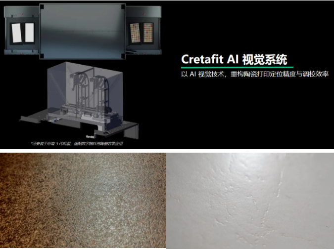 · AI智能對(duì)位加持:融入CretaFit AI視覺系統(tǒng),進(jìn)料處精準(zhǔn)識(shí)別瓷磚位置與浮雕紋理,實(shí)時(shí)完成圖形平移、旋轉(zhuǎn)調(diào)整,毫米級(jí)定位打印無需停機(jī),避免疊印與墨水浪費(fèi),大幅提升生產(chǎn)效率。