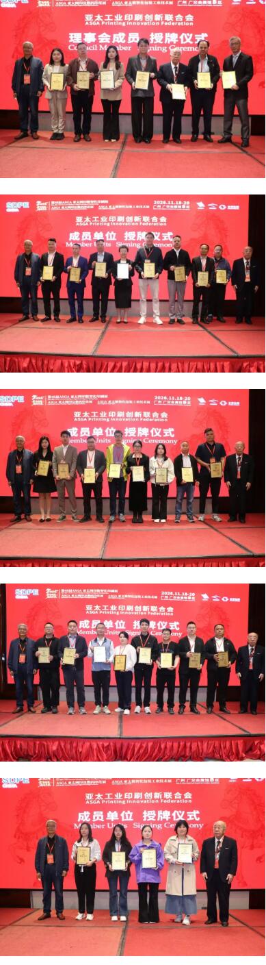 發(fā)布會現(xiàn)場還舉行了隆重的簽約與授牌儀式。各方主辦單位 完成合作簽約,正式確立共同主辦第48屆ASGA亞太網(wǎng)印數(shù)智化印刷展,為展會的高品質(zhì)舉辦筑牢合作根基;同時向亞太成員國協(xié)會代表及企業(yè)授牌,進一步夯實亞太地區(qū)網(wǎng)印數(shù)碼印花行業(yè)的協(xié)作基礎,為展會的國際化布局奠定堅實保障。至此,新聞發(fā)布會在熱烈的氛圍中圓滿落幕,衷心感謝各位領導、嘉賓、行業(yè)同仁與媒體朋友的蒞臨參與和鼎力支持!2026年11月18日,我們廣州不見不散!