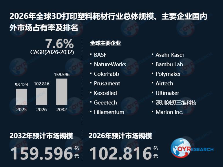 2025年全球3D打印塑料耗材市場銷售額達到98億元人民幣,預計到2032年將攀升至159.6億元人民幣,2026至2032年期間年復合增長率(CAGR)為7.6%。