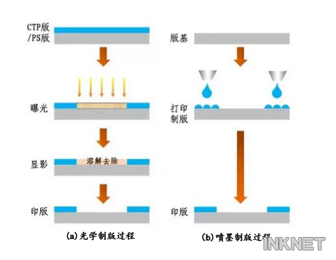 噴墨制版技術是通過噴墨的方式將特殊的納米墨水直接打印至版基表面實現(xiàn)圖文的塑造,在版基表面形成圖文區(qū)(親油)、非圖文區(qū)(親水)的差異,經(jīng)固化后形成用于上機印刷的印版。該技術無需感光成像過程中的顯影環(huán)節(jié),簡化制版流程,消除了印版顯影的污染,詳細過程如下圖所示。
