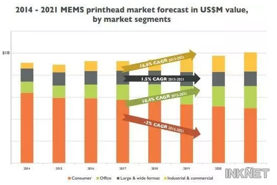 2021年MEMS噴墨打印頭市場(chǎng)將達(dá)10億美元,其中辦公、商業(yè)和工業(yè)打印市場(chǎng)約為3.65億美元