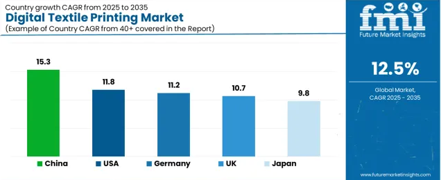 全球數(shù)碼紡織印花市場正經(jīng)歷強(qiáng)勁增長,其中中國市場預(yù)計將以15.3%的復(fù)合年增長率領(lǐng)跑,直至2035年。這一增長主要得益于不斷擴(kuò)大的紡織制造業(yè)基礎(chǔ)、蓬勃發(fā)展的時尚產(chǎn)業(yè)以及先進(jìn)印花技術(shù)的日益普及。美國緊隨其后,復(fù)合年增長率為11.8%,其增長動力來自不斷上升的定制化趨勢、日益完善的電子商務(wù)基礎(chǔ)設(shè)施以及對按需生產(chǎn)解決方案的日益接受。