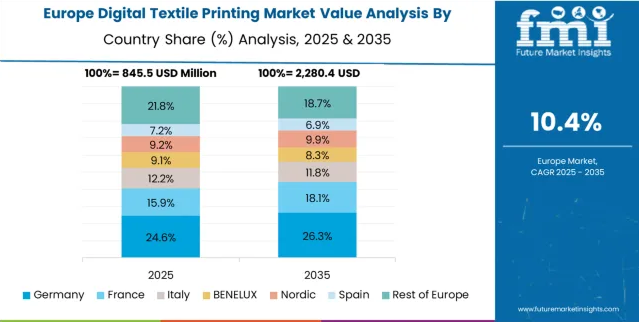 歐洲數(shù)碼紡織印花市場預(yù)計將從2025年的13億美元增長到2035年的41億美元,預(yù)測期內(nèi)復(fù)合年增長率(CAGR)為12.2%。德國憑借其強(qiáng)大的產(chǎn)業(yè)基礎(chǔ)和對高端、技術(shù)先進(jìn)的印花系統(tǒng)的需求,在2025年占據(jù)該地區(qū)28.0%的市場份額,并預(yù)計到2035年仍將保持這一份額。